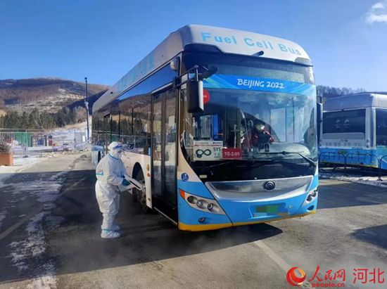 張家口賽區(qū)運(yùn)行保障團(tuán)隊(duì)工作人員在對(duì)車輛進(jìn)行消毒工作。 譚磊攝