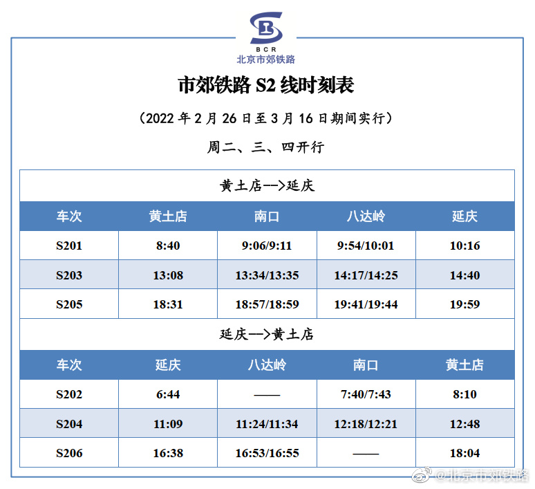 人民網(wǎng)北京2月25日電 據(jù)北京市郊鐵路官方微博消息,根據(jù)鐵路運輸調(diào)整通知,2022年2月26日至3月16日, S2線恢復周二、三、四3對/日,周五、六、日、一及小長假7對/日的列車開行方案,列車開行時點無變化,具體列車時刻表如下所示。