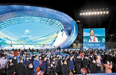 3月6日晚,北京冬殘奧會張家口賽區(qū)首場獎牌頒發(fā)儀式在張家口頒獎廣場舉行。 河北日報記者 賈 恒攝