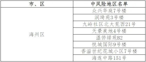 通告稱,根據(jù)國務(wù)院聯(lián)防聯(lián)控機制有關(guān)規(guī)定,經(jīng)綜合評估研判,市指揮部決定,自2022年3月6日0時起,將眾興華庭7號樓、潤琦苑3號樓、九嶺社區(qū)北大荒西21號、天景美地4號樓、溫僑綠苑B2、悅城國際9號樓、香溢世紀(jì)花城小區(qū)7號樓、海連中路151號調(diào)整為中風(fēng)險地區(qū),其他地區(qū)風(fēng)險等級不變。