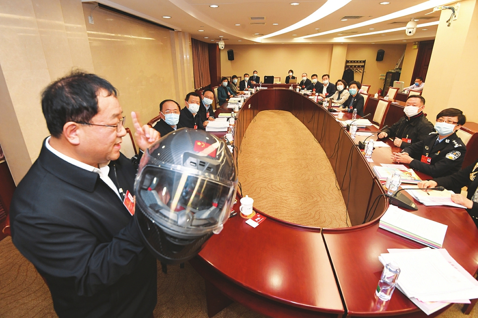 3月7日,山西代表團舉行小組會議。呂春祥代表對政府工作報告提出的“今年深入實施創(chuàng)新驅動發(fā)展戰(zhàn)略”深感振奮,對“推進科技創(chuàng)新,促進產(chǎn)業(yè)優(yōu)化升級,突破供給約束堵點,依靠創(chuàng)新提高發(fā)展質(zhì)量”充滿信心。他展示了其所在的中科院山西煤化所和山西鋼科碳材料有限公司碳纖維聯(lián)合團隊研發(fā)的TG800碳纖維材料,這一材料應用于雪車頭盔,成為今年北京冬奧會上亮眼的山西名片。(記者李聯(lián)軍攝)