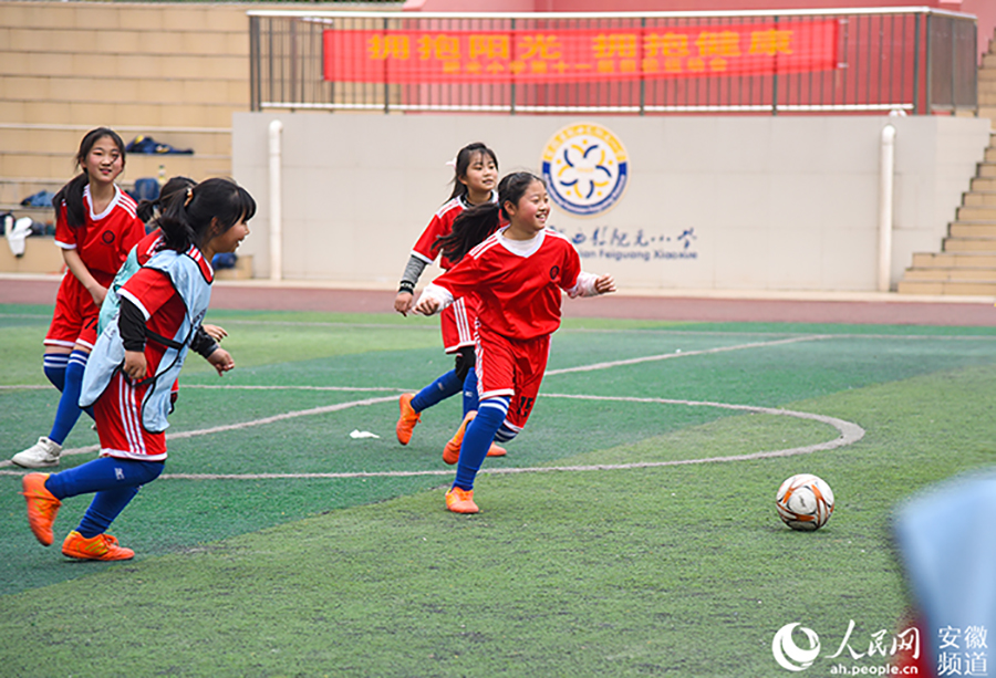 “小足球女將”們?cè)谇驁?chǎng)上快樂(lè)奔跑。人民網(wǎng) 李希蒙攝