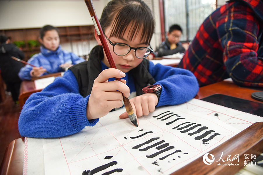 “小小書(shū)法家”正在認(rèn)真練習(xí)書(shū)寫(xiě)。人民網(wǎng) 李希蒙攝