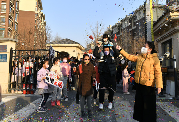在潤(rùn)澤悅溪小區(qū)門口,工作人員快速拆除快遞架,小區(qū)大門緩緩打開,居民們興高采烈地結(jié)伴走出小區(qū)。社區(qū)黨委書記、居委會(huì)主任分別向志愿者代表頒發(fā)證書并送上鮮花,向入駐社工、民警、機(jī)關(guān)工作人員獻(xiàn)上鮮花,為社區(qū)衛(wèi)生服務(wù)中心和來(lái)廣營(yíng)派出所送錦旗,為愛心企業(yè)頒發(fā)獎(jiǎng)牌。居民代表向社區(qū)黨委及小區(qū)物業(yè)送錦旗。3月8日也是國(guó)際婦女節(jié),地區(qū)特意制作了電子賀卡,為每位女性同胞送上節(jié)日祝福。