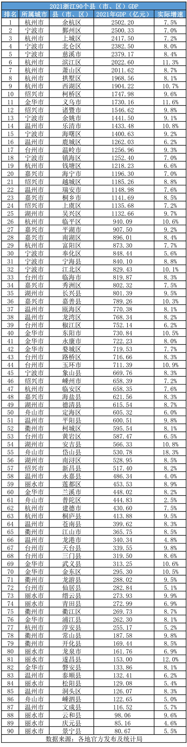 2021年,浙江7個(gè)GDP超2000億元的縣(市、區(qū))被杭甬雙城包攬,分別占據(jù)4席、3席。