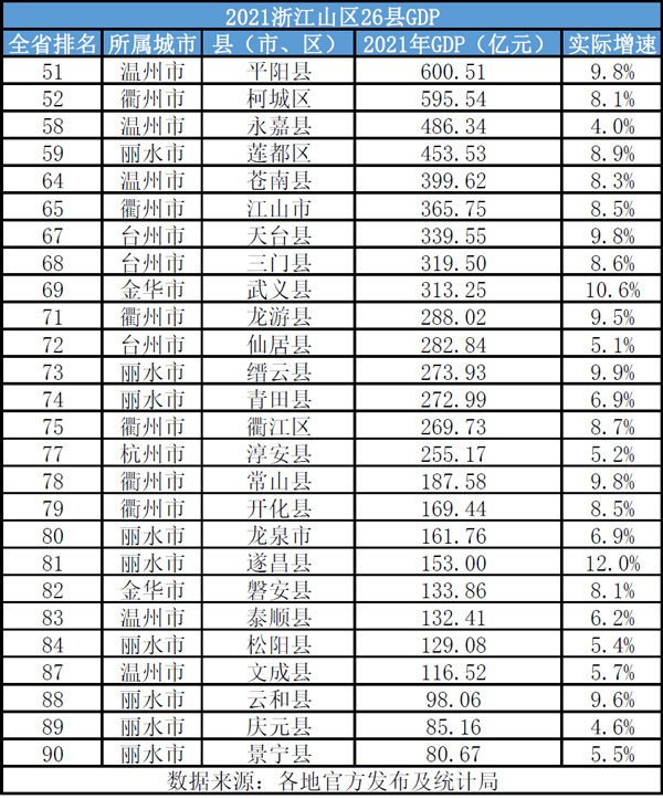 2021年浙江山區(qū)26縣GDP總量排名。制圖:葉賓得