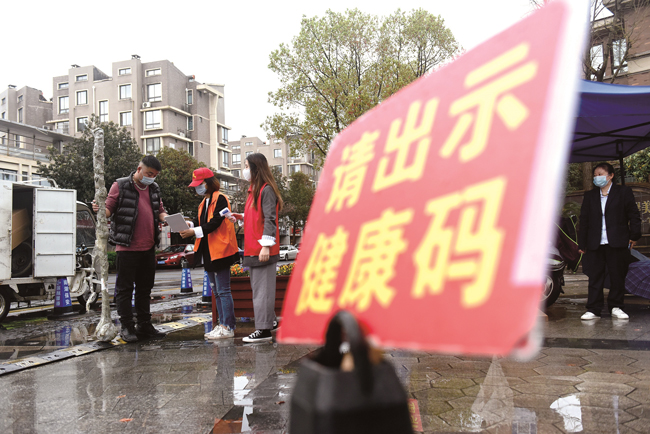 3月17日,在嘉興秀洲區(qū)一家小區(qū)門口,工作人員身著紅馬甲和同伴冒雨堅守在小區(qū)門口,開展替崗輪值,協(xié)助社區(qū)干部對進(jìn)入小區(qū)的人員逐一驗(yàn)碼測溫,筑牢疫情防控安全線。(馮玉坤)