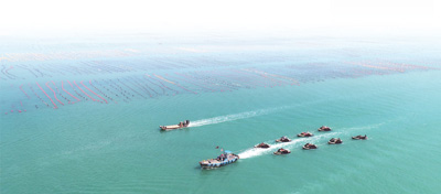 在山東省榮成市愛(ài)倫灣海域,養(yǎng)殖工人駕駛滿(mǎn)載江蘺的舢板駛向碼頭。