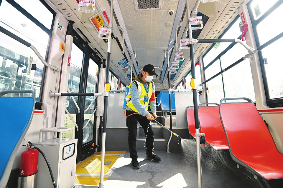 3月16日,太原公交三公司三車隊(duì)內(nèi),工作人員正在對(duì)公交車座位、拉手進(jìn)行消殺,嚴(yán)格執(zhí)行疫情防控措施,確保市民乘車安全。(記者阮洋攝)