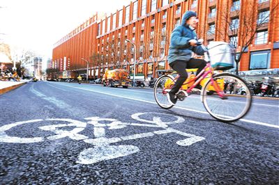 王府井慢行系統(tǒng)改造升級(jí)后,市民騎車(chē)經(jīng)過(guò) 攝/本報(bào)記者 黃亮