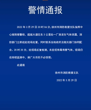 徐州市消防救援支隊(duì)在當(dāng)晚24時(shí)左右發(fā)布的警情通報(bào)中表示,3月29日20時(shí)06分,徐州市消防救援支隊(duì)指揮中心接到報(bào)警稱,超越大道往東3公里處一廠房發(fā)生氣體泄露,消防部門(mén)立即趕赴現(xiàn)場(chǎng)處置,同時(shí)聯(lián)系當(dāng)?shù)卣跋嚓P(guān)部門(mén)協(xié)同配合。20時(shí)25分,經(jīng)現(xiàn)場(chǎng)反復(fù)檢測(cè),未發(fā)現(xiàn)有毒有害氣體,現(xiàn)場(chǎng)仍在持續(xù)監(jiān)測(cè)中。