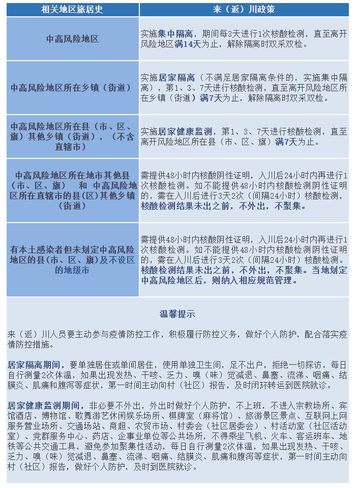 3、對有上海旅居史,于3月14日至23日的來(返)川人員,已解除管控的再進行1次核酸檢測(3月24日至28日的來(返)川人員繼續(xù)執(zhí)行居家健康監(jiān)測相關(guān)要求)。