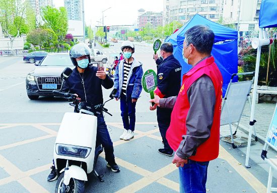 4月5日,在金華婺城區(qū)城東街道通園路社區(qū)各暖心服務(wù)點、小區(qū)出入口,管理人員落實測溫、亮碼、戴口罩的要求,“場所碼”逢進(jìn)必掃,社區(qū)自行設(shè)計了便攜式“掃碼桿”。使用“掃碼桿”后,過往車輛和行人掃碼的效率明顯提高,縮短了通過時間,拉開了志愿者和來往車輛及人員的距離,避免人員接觸。(時寬兵)