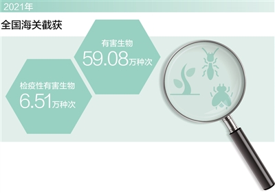 據(jù)統(tǒng)計(jì),2021年,全國(guó)海關(guān)截獲有害生物59.08萬(wàn)種次、檢疫性有害生物6.51萬(wàn)種次,首次檢出致死粒線蟲、鈴蘭短體線蟲、北美齒小蠹等危險(xiǎn)性有害生物,有效防止紅火蟻、高致病性禽流感等重大動(dòng)植物疫情疫病傳入,退回、銷毀不合格農(nóng)產(chǎn)品584批。