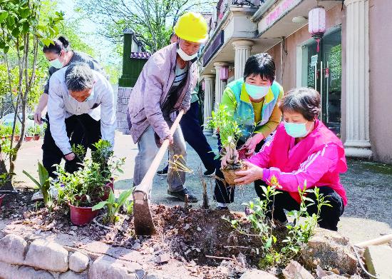 近日,金華市區(qū)城中街道楊思嶺社區(qū)企退人員、黨員志愿者開展“愛心植樹、綠色環(huán)?!睂嵺`活動,在公共花壇泥土裸露的地方,補栽梔子花、風尾花等花卉,美化社區(qū)環(huán)境。(時寬兵)