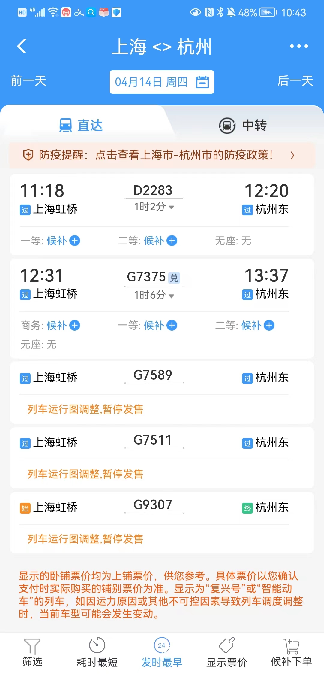 以查詢4月14日上海-杭州的火車票為例,僅剩的5趟列車中,D2283、G7375只是從上海虹橋站經(jīng)過,車票售罄是因?yàn)橘I票的幾乎都是別的城市上車的旅客,實(shí)際從虹橋站上車的旅客幾乎沒有;另外兩趟在上海虹橋站的過路車(G7589、G7511)和一趟始發(fā)車(G9307)干脆已暫停發(fā)售車票,更不存在大量上海出發(fā)旅客買票的可能。