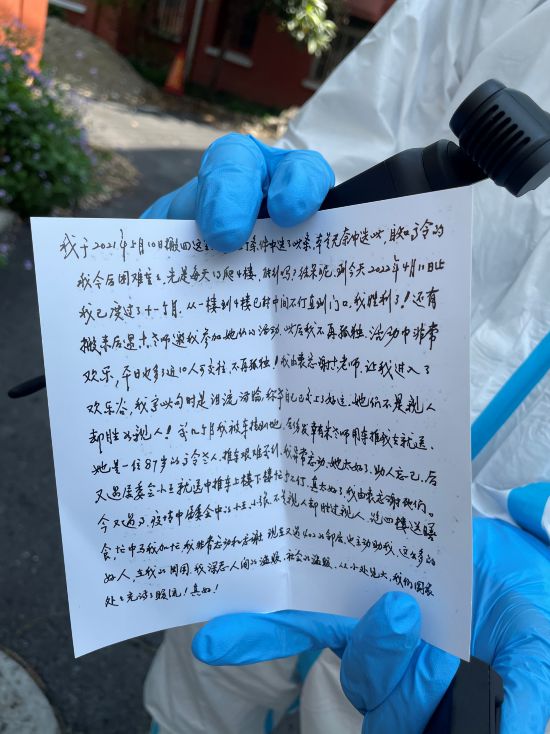 幾經(jīng)推辭,錢留在老人家手里,但她還執(zhí)拗地遞來兩封信,一封短的,本來包鈔票用的:這是給您們和廣大志愿者添些營(yíng)養(yǎng)品用,望勿拒。還有封長(zhǎng)信里提到,“疫情中,居委會(huì)的小王、小張,不是親人卻勝過親人,跑四樓送膳食,我非常感謝?!?/p>