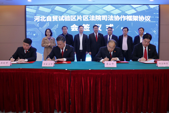 河北自貿(mào)試驗區(qū)片區(qū)法院司法協(xié)作框架協(xié)議會簽儀式現(xiàn)場。 張亞寧攝
