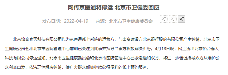 4月18日晚,網(wǎng)上流出北京怡合春天科技有限公司停運(yùn)通知。北京市衛(wèi)生健康委員會(huì)和北京市醫(yī)院管理中心已緊急通知雙方,將進(jìn)一步督促指導(dǎo)雙方從維護(hù)公眾利益出發(fā),依法理性解決糾紛,使廣大群眾能夠繼續(xù)獲得便利的線上預(yù)約服務(wù)。