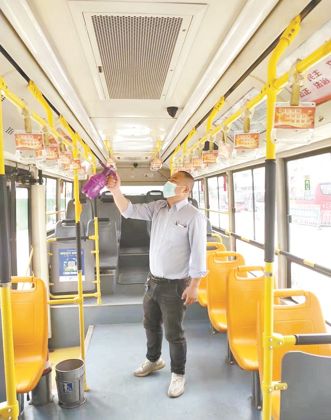 發(fā)車(chē)前,柴曉軍對(duì)車(chē)內(nèi)認(rèn)真消毒。