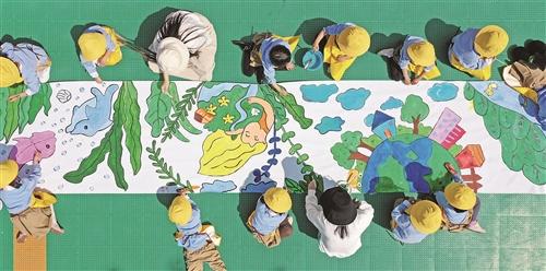 4月21日,臺州仙居縣幼兒園的孩子們在老師指導(dǎo)下創(chuàng)作珍愛地球主題繪畫作品。當(dāng)日,幼兒園開展以“珍愛地球 人與自然和諧共生”為主題的教育活動,迎接“世界地球日”到來。通過繪長卷、環(huán)保時(shí)裝秀、垃圾分類等教育活動,引導(dǎo)孩子們愛護(hù)環(huán)境,共同守護(hù)地球母親。