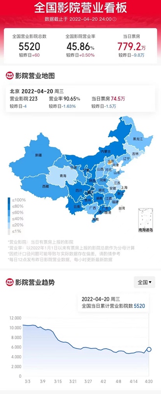 據(jù)國內(nèi)某專業(yè)電影數(shù)據(jù)平臺,4月20日全國影院營業(yè)率45.86%,營業(yè)影院5520家,較上日增加60家,大盤票房779.2萬元。截至4月20日23時(shí),浙江省單日票房(4月20日)約為64萬元,總出票17678張,總場次13722場,平均票價(jià)36元。