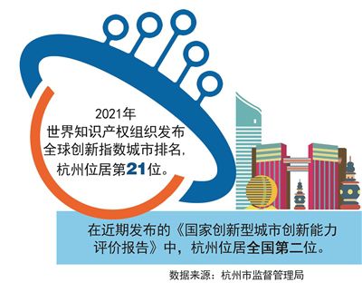 2021年以來,杭州知識產(chǎn)權(quán)工作堅(jiān)持以數(shù)字化改革為引領(lǐng),以推動高質(zhì)量發(fā)展為目標(biāo),著力完善體系,持續(xù)協(xié)同發(fā)力,為高質(zhì)量發(fā)展建設(shè)共同富裕示范區(qū)城市范例提供了有力支撐。截至2021年底,杭州市有效發(fā)明專利擁有量9.5萬件,居全國省會城市第一,其中,高價(jià)值發(fā)明專利39842件,占比41.9%;杭州市有效注冊商標(biāo)102.56萬件,居全國省會城市第二;2021年浙江省設(shè)區(qū)市知識產(chǎn)權(quán)保護(hù)工作考核優(yōu)秀,位居第一;2021年世界知識產(chǎn)權(quán)組織發(fā)布全球創(chuàng)新指數(shù)城市排名,杭州位居第21位;在近期發(fā)布的《國家創(chuàng)新型城市創(chuàng)新能力評價(jià)報(bào)告》中,杭州位居全國第二位。