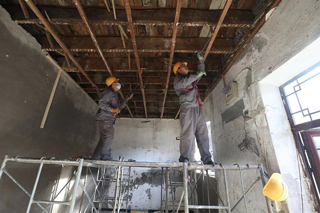 按照計(jì)劃,樓頂將由原來的木質(zhì)大屋脊整體更換為樹脂瓦阻燃屋面。而在第一階段改造中,樓體阻燃,為居民量身訂制燃?xì)夤?,配?4小時(shí)巡護(hù)“管家”,每天進(jìn)行巡查記錄并拍攝現(xiàn)場(chǎng)照片均已完成。一層的臨街房屋內(nèi)的夾層已經(jīng)拆除完畢,木制窗已經(jīng)更換為塑鋼窗,原來的薄墻面上加裝硅酸鈣板,地面鋪設(shè)了耐火地板磚,屋頂?shù)跹b了石膏板。二層樓內(nèi)木樓板已鋪設(shè)耐火瓷磚,樓內(nèi)電線電纜進(jìn)行了梳理排查,完成了整體更換,鋪設(shè)了不銹鋼槽式電纜橋架,確保樓內(nèi)居民用電安全穩(wěn)定。
