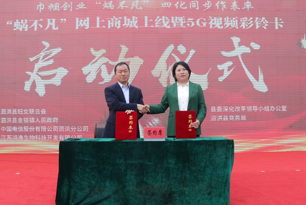 近日,江蘇省泗洪縣婦聯(lián)、改革辦、商務(wù)局、金鎖鎮(zhèn)人民政府和電信公司聯(lián)合舉辦“巾幗創(chuàng)業(yè)‘蝸不凡’,‘四化’同步作表率”現(xiàn)場活動,助力鄉(xiāng)村企業(yè)數(shù)字化復(fù)工復(fù)產(chǎn)?!拔伈环病本W(wǎng)上商城正式上線,5G視頻彩鈴卡同步啟動,電信公司和“蝸不凡”品牌企業(yè)簽訂了“云改數(shù)轉(zhuǎn)”合作協(xié)議。
