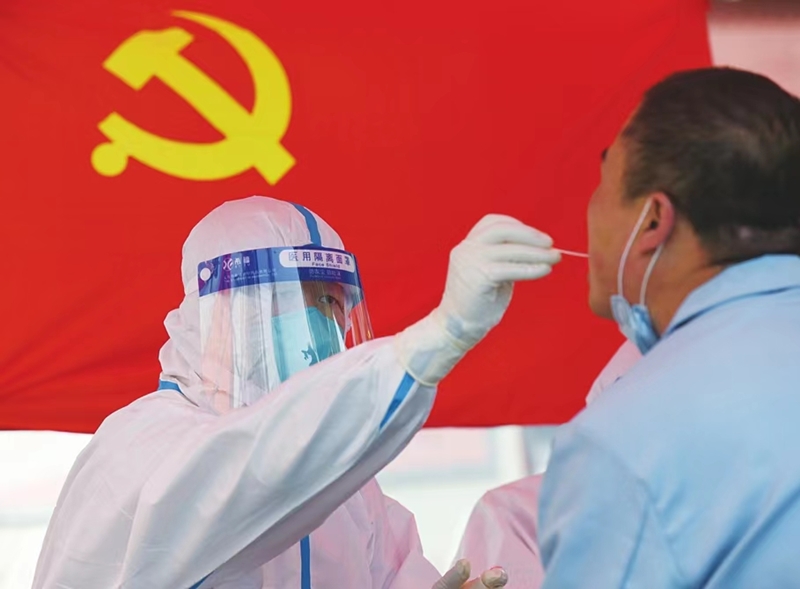 把黨旗插在第一線,以實(shí)際行動(dòng)筑牢疫情防控“紅色防線”。4月26日,太原市迎澤區(qū)開展第三輪全員核酸檢測,在各個(gè)檢測點(diǎn),最忙碌的還是身著防護(hù)服的“大白”,他們耐心又細(xì)致地為居民做著核酸檢測。武六紅 攝