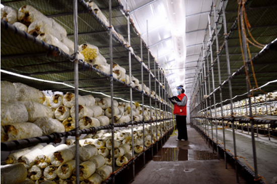 邯鄲市廣平縣十里鋪鎮(zhèn)陳固村農(nóng)事代辦志愿者走進(jìn)陳固村菌菇大棚,查看菌菇長勢。武小凱攝