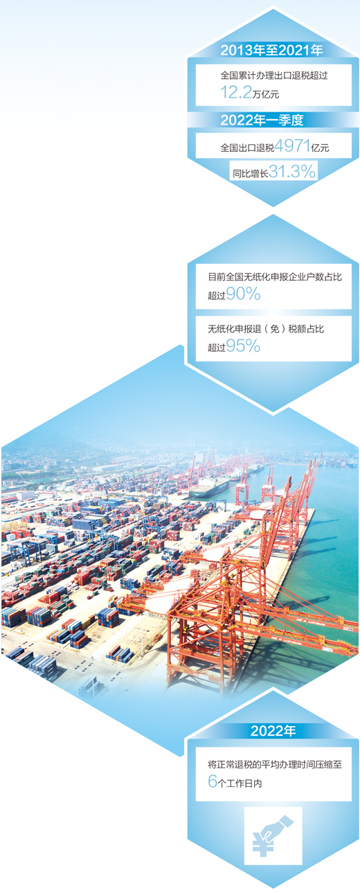資金是企業(yè)的生命線。為助力外貿(mào)企業(yè)發(fā)展,財稅部門落實出口退稅政策,持續(xù)優(yōu)化出口退稅管理。2020年國家提高1464項產(chǎn)品的出口退稅率,稅務(wù)部門加強宣傳輔導(dǎo)、精準(zhǔn)推送,截至2021年底,共有9.4萬戶企業(yè)因這項政策受益,累計新增退稅377億元,進一步增強了競爭力和抗壓力。2021年,國家稅務(wù)總局以出口退稅信息系統(tǒng)整合優(yōu)化為契機,大幅簡并優(yōu)化退稅申報表單資料及辦稅流程,使出口退稅管理體系業(yè)務(wù)更全面、流程更優(yōu)化、權(quán)責(zé)更清晰、運行更高效。
