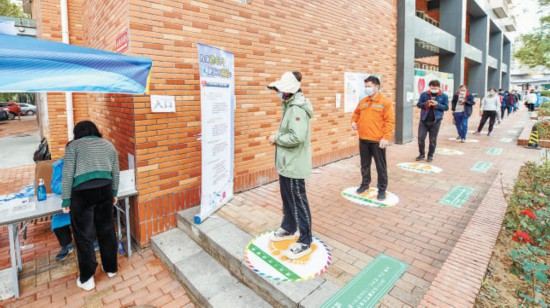 本報訊(記者 李瑤)昨天,東城區(qū)東四街道在轄區(qū)內(nèi)5個常態(tài)化核酸檢測點(diǎn)推出新式“兩米線”,通過充滿童趣的“呼啦圈”地貼,引導(dǎo)居民有序排隊,保持安全距離?!昂衾踩Α敝睆酱蠹s80厘米,中間黃色腳印圖案十分醒目,旁邊還印有疫情防控科普貼,居民站在圈內(nèi)有序排隊等待核酸檢測?!啊粌H富有童趣,使排隊等候不再那么乏味,還嚴(yán)格規(guī)定了排隊距離,保證大家的安全?!本用顸c(diǎn)贊說。本報記者 鄧偉攝