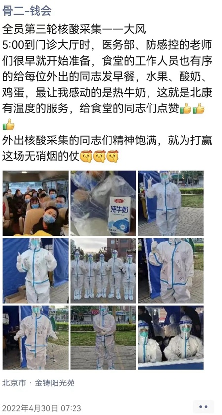 4月30日是五一小長假第一天,晚7點(diǎn),宣武醫(yī)院神經(jīng)內(nèi)科電生理專業(yè)組工作群的消息突然響了,組長黃朝陽發(fā)布了一條信息:“5月1日和3日各需5人支援西城核酸采樣任務(wù),請大家積極響應(yīng),積極報(bào)名!”看到醫(yī)院緊急通知,同事們用無聲、快速地接龍做出了回應(yīng),名額很快報(bào)滿,很多沒報(bào)上的同事還主動(dòng)要求成為候補(bǔ)。