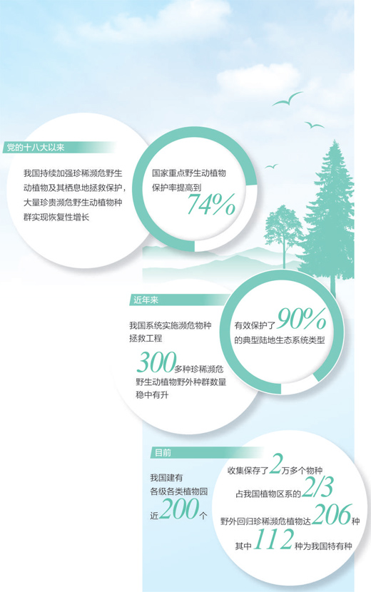 近年來,我國系統(tǒng)實(shí)施瀕危物種拯救工程,采取就地保護(hù)、遷地保護(hù)、放歸(回歸)自然、人工繁育(培植)等措施,有效保護(hù)了90%的典型陸地生態(tài)系統(tǒng)類型,300多種珍稀瀕危野生動植物野外種群數(shù)量穩(wěn)中有升。目前,我國建有各級各類植物園近200個,收集保存了2萬多個物種,占我國植物區(qū)系的2/3。野外回歸珍稀瀕危植物達(dá)到206種,其中112種為我國特有種。麋鹿、普氏野馬曾一度在野外消失,目前通過人工繁育等方式,總數(shù)分別達(dá)近1萬只和700只左右,并成功實(shí)施放歸自然,重新建立了野外種群,生存區(qū)域和范圍不斷擴(kuò)大。