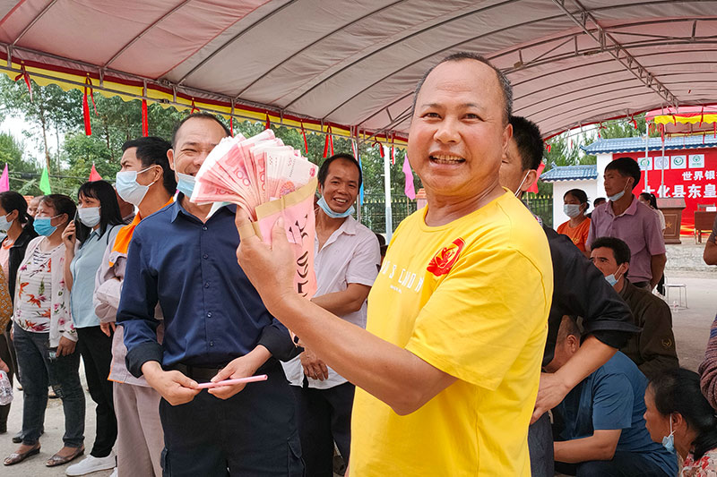 人民網(wǎng)大化5月27日電 5月26日,廣西大化瑤族自治縣都陽鎮(zhèn)忠武村東皇嶺農(nóng)民專業(yè)合作社召開2021年度分紅大會。175名入股村民喜滋滋地數(shù)著手中的“大紅包”,欣喜溢于言表。
