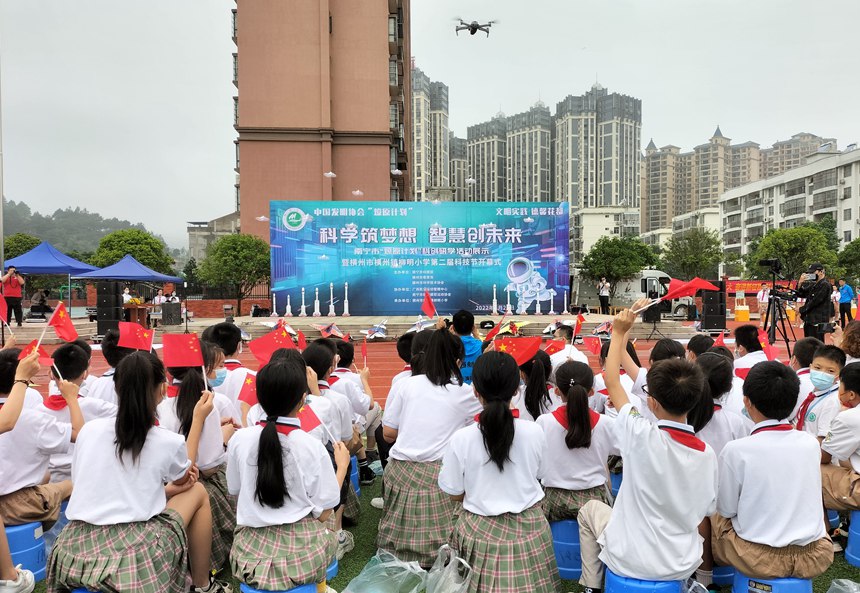 當天,開幕式舉行了升國旗儀式,進行了“柳芽夢二號”、傘降火箭升空及放飛紙飛機活動。南寧市科技館展示了科學實驗秀、機器人舞蹈等節(jié)目;廣西航空運動管理中心進行了無人機集群編舞、遙控固定翼3D花式特技等航模飛行表演;柳明小學師生帶來了科普劇《綠色動員令》《科學用眼》,環(huán)保服裝走秀《美麗的四季》。開幕式結束后,蒙科祺還參觀指導了科技節(jié)校內活動及學生作品。