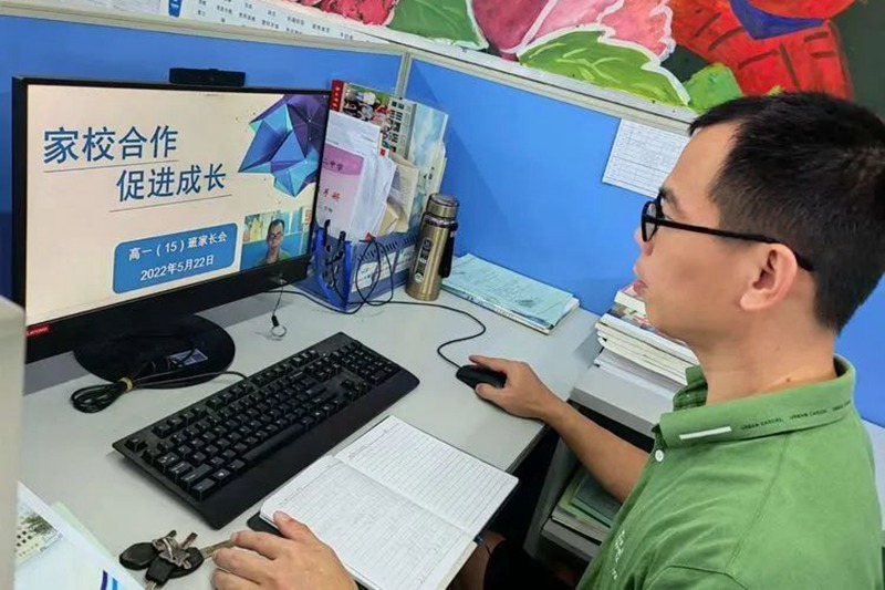 5月22號(hào)(捐獻(xiàn)造血干細(xì)胞的前一天),韓熠光在年級(jí)辦公室召開線上家長會(huì)。??谑械诙袑W(xué)供圖