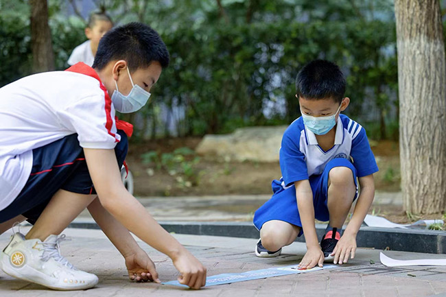 陶然亭街道大吉巷社區(qū)的一處核酸點位上,兩米線安全提示標識引起大伙兒注意?!氨苊饩奂?,嚴防疫情”“綠色出行,愛心助考”“文明陪考,安全第一”……誰能想到這些醒目的標語竟然是“陶然娃”們想的“愛心助考公約”?!榜R上就是高考了,希望哥哥姐姐們能取得好成績,不辜負自己多年的努力。”13歲的陳博一趴在地上,奮力的拍了拍自己剛剛貼好的“公約宣傳條”。