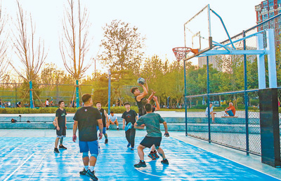 河北省石家莊市長(zhǎng)安區(qū)拾光智慧體育公園里,市民正在打籃球。這座專業(yè)體育公園5月1日開(kāi)放,以專業(yè)的運(yùn)動(dòng)設(shè)施和優(yōu)美的健身環(huán)境,吸引眾多市民前來(lái)鍛煉。近年來(lái),各地大力新建改建體育場(chǎng)地設(shè)施,為全民健身全面開(kāi)展夯實(shí)基礎(chǔ)。