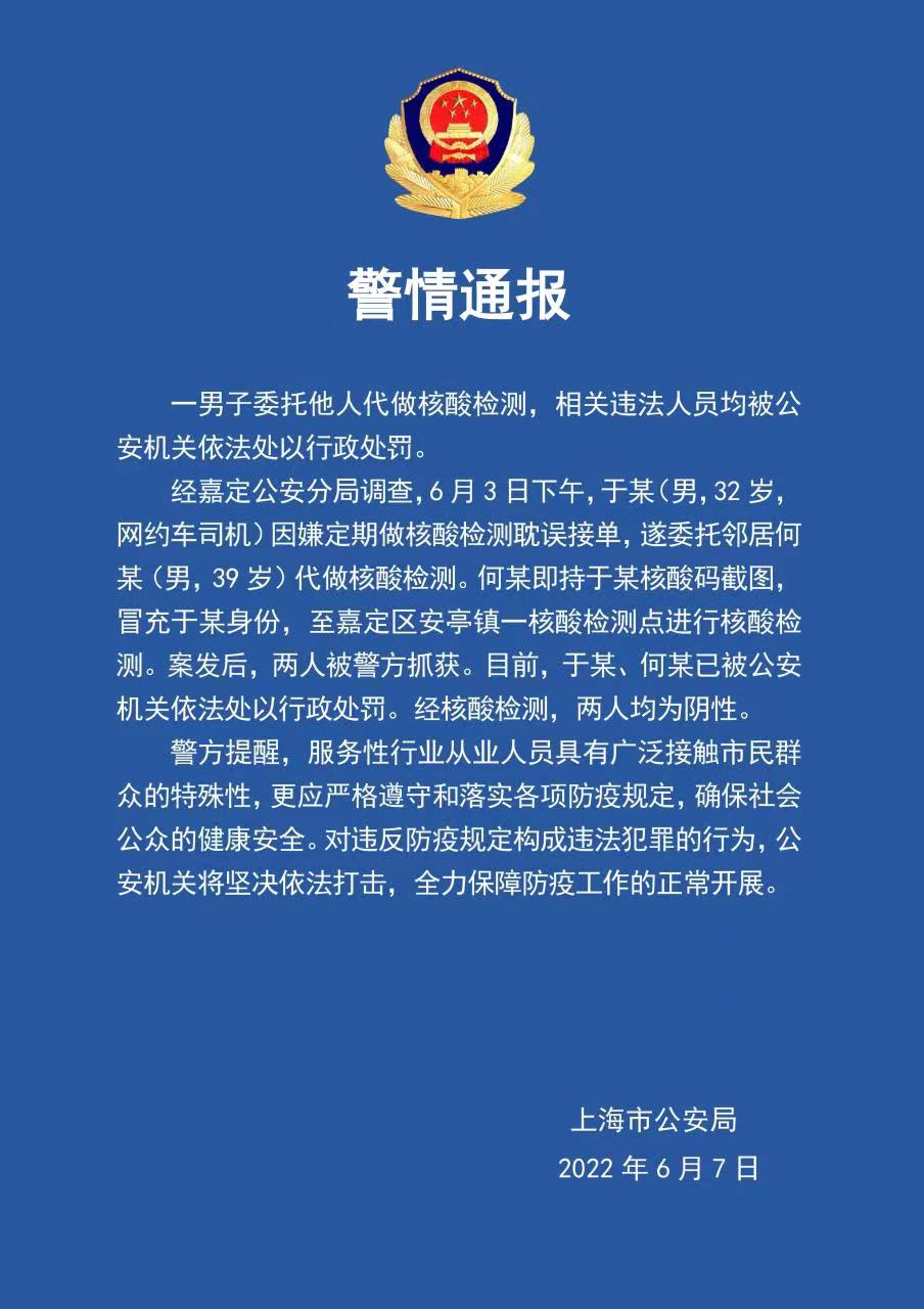 經(jīng)嘉定公安分局調(diào)查,6月3日下午,于某(男,32歲,網(wǎng)約車司機(jī))因嫌定期做核酸檢測耽誤接單,遂委托鄰居何某(男,39歲)代做核酸檢測。何某即持于某核酸碼截圖,冒充于某身份,至嘉定區(qū)安亭鎮(zhèn)一核酸檢測點(diǎn)進(jìn)行核酸檢測。案發(fā)后,兩人被警方抓獲。目前,于某、何某已被公安機(jī)關(guān)依法處以行政處罰。經(jīng)核酸檢測,兩人均為陰性。