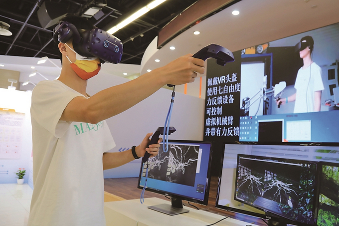 五月二十七日,東南大學(xué)舉辦“科學(xué)名世、人才報國”教學(xué)科研成果展,圖為現(xiàn)場展示的VR世界里操控虛擬機(jī)械臂。 本報記者 劉莉 攝