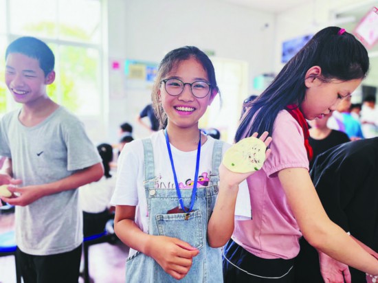為什么會讓學生學做燒餅?zāi)??校長王國寶這樣解釋:“縉云燒餅的制作技藝是國家級非物質(zhì)文化遺產(chǎn),讓學生傳承這項技藝,也能讓他們感受縉云人記憶深處的味道。六年級的同學即將畢業(yè),以后他們會離開縉云展翅高飛,真心希望他們能記住縉云燒餅這個回家的路標。”