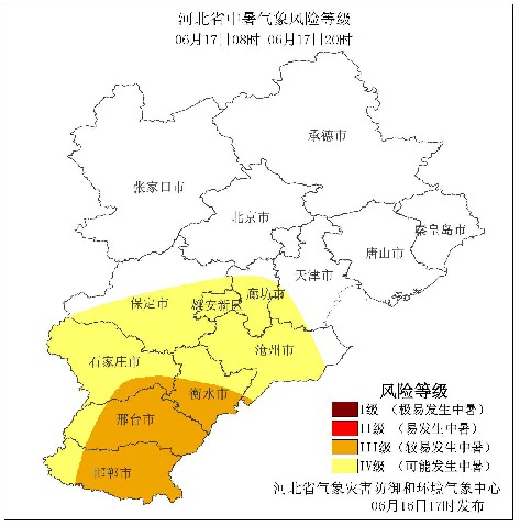 據(jù)了解,河北省氣象災(zāi)害防御和環(huán)境氣象中心2022年6月16日17時發(fā)布中暑氣象風(fēng)險等級預(yù)報:明天白天,保定、廊坊以南大部分地區(qū)中暑氣象風(fēng)險等級在IV級及以上,可能發(fā)生中暑,其中衡水南部、邢臺和邯鄲兩市的中東部地區(qū)中暑氣象風(fēng)險等級為Ⅲ級,較易發(fā)生中暑,請注意防范。