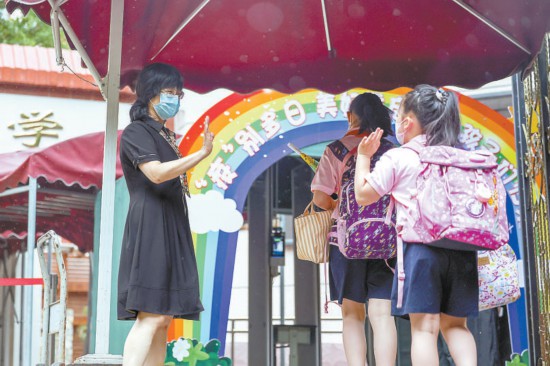 昨天早晨,豐臺(tái)區(qū)芳古園小學(xué),因疫情闊別校園多日的小學(xué)生返校復(fù)課,老師在校門口歡迎孩子們歸來(lái)。本報(bào)記者 鄧偉攝