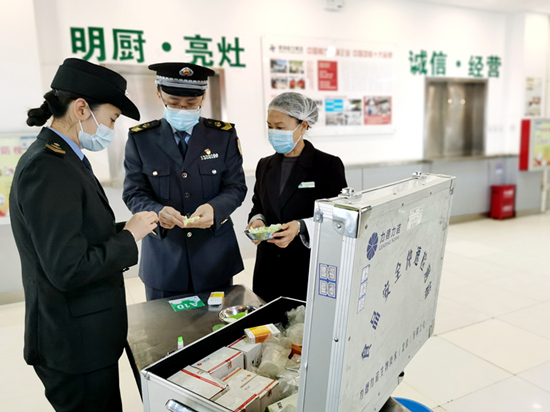 邢臺市市場監(jiān)管部門執(zhí)法人員到第十九中學(xué)后廚對食品進行快檢。 黃濤攝