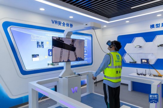 工作人員在雄安新區(qū)一智慧工地展示廳進(jìn)行工地VR安全體驗(2022年4月13日攝)。新華社發(fā)(高盟 攝)