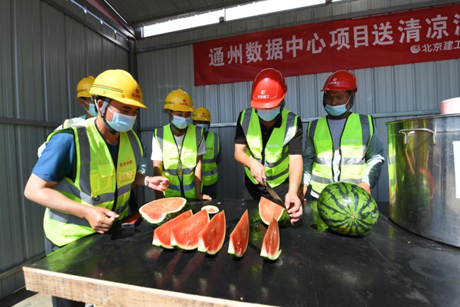 在通州數(shù)據(jù)中心項(xiàng)目頂板鋪設(shè)施工現(xiàn)場(chǎng),高溫對(duì)奮戰(zhàn)在施工一線的員工來(lái)說(shuō)無(wú)疑是一場(chǎng)巨大的“烤驗(yàn)”?!半m然現(xiàn)場(chǎng)的溫度達(dá)到了38℃,但是項(xiàng)目部合理調(diào)配時(shí)間,對(duì)現(xiàn)場(chǎng)的防暑降溫工作做了全面部署,施工現(xiàn)場(chǎng)配備了西瓜、綠豆湯、藿香正氣水和清涼油等防暑物資,在場(chǎng)邊設(shè)置了遮陽(yáng)涼棚,并且讓施工人員避開上10點(diǎn)到下午3點(diǎn)的高溫期錯(cuò)時(shí)上崗,保證現(xiàn)場(chǎng)安全生產(chǎn)的同時(shí)也盡量不耽誤項(xiàng)目進(jìn)度?!表?xiàng)目部負(fù)責(zé)人胡永忠說(shuō)。