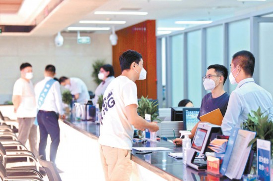 昨天,北京經(jīng)濟(jì)技術(shù)開(kāi)發(fā)區(qū)政務(wù)服務(wù)大廳,工作人員正在熱情接待企業(yè)代表辦理相關(guān)業(yè)務(wù)。本報(bào)記者 和冠欣攝