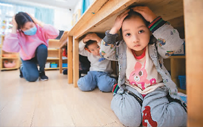 圖四:江蘇省南京市雨花臺區(qū)龍福幼兒園小朋友們學習防災(zāi)減災(zāi)自救技能。蘇陽攝(人民視覺)